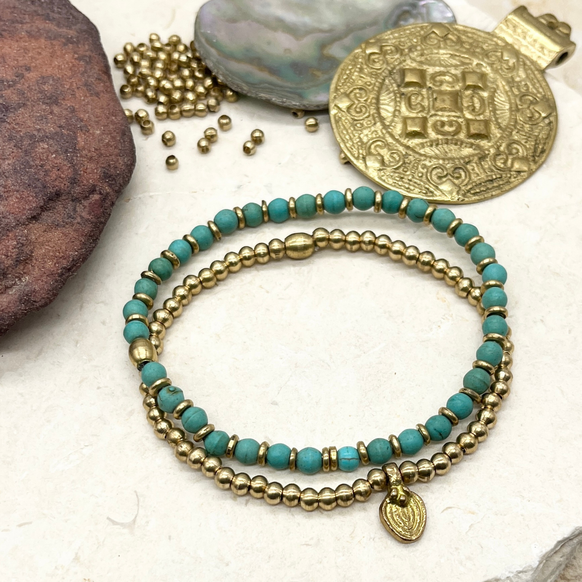 סט צמידים- טורקיז ובראס עם תליון
