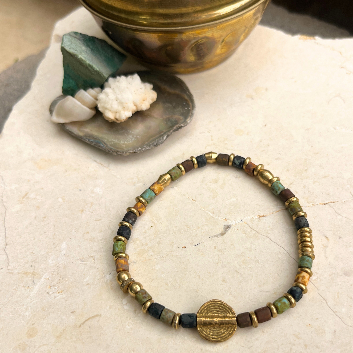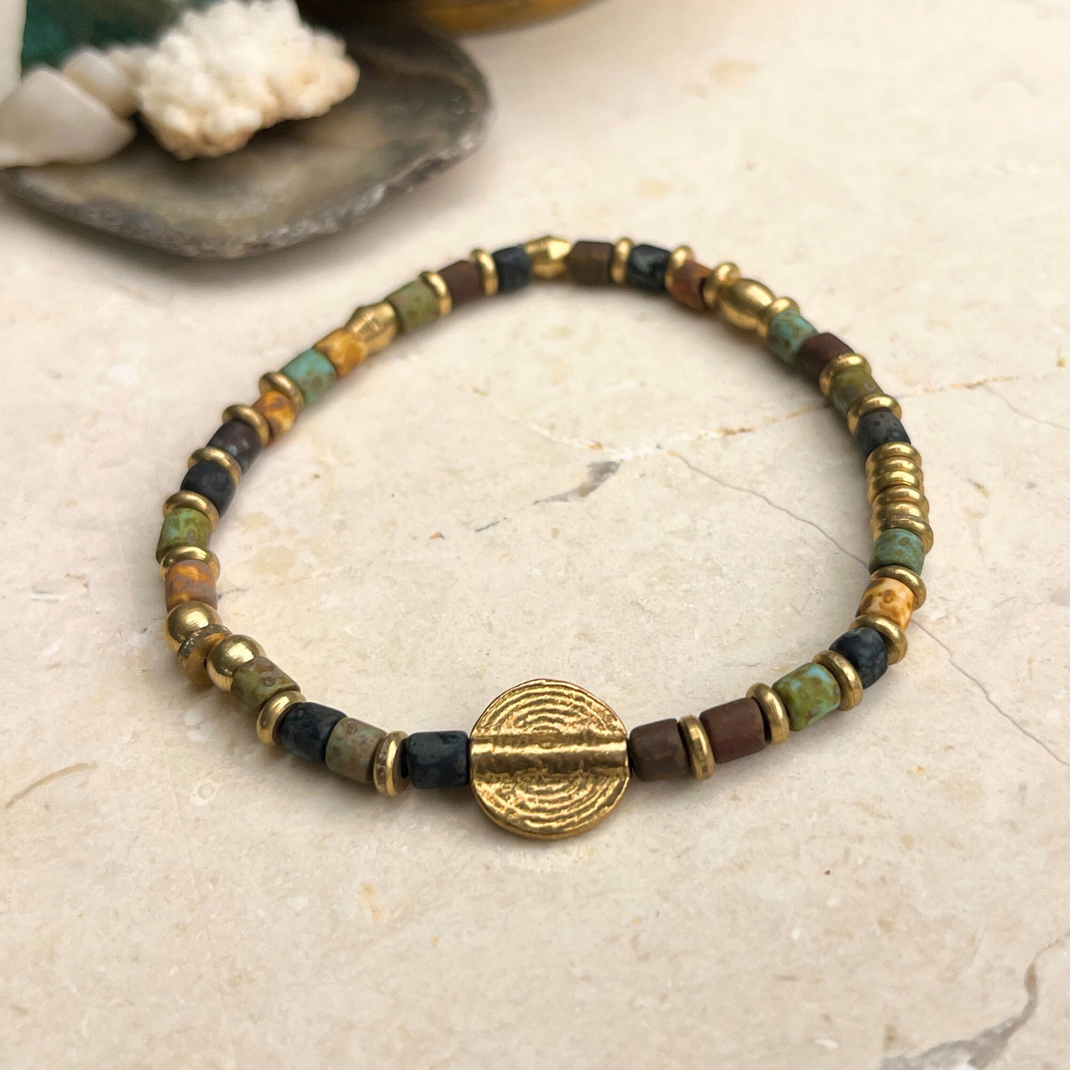 הצמיד עשוי חרוזי זכוכית יפניים וחרוזי בראס, על חוט אלסטי חזק במיוחד
