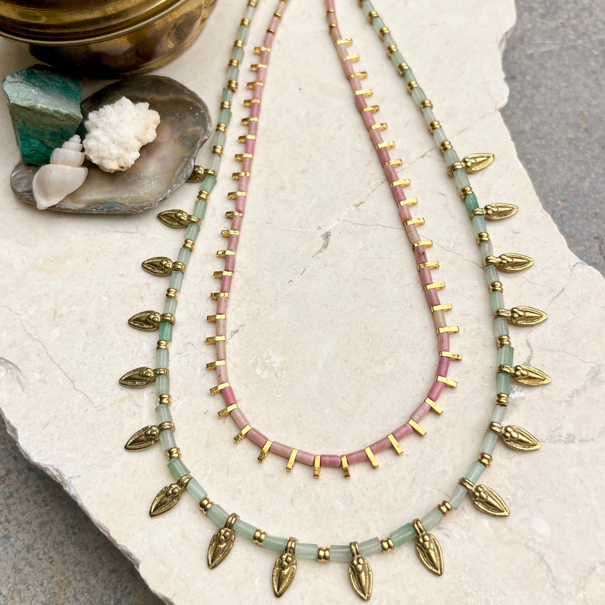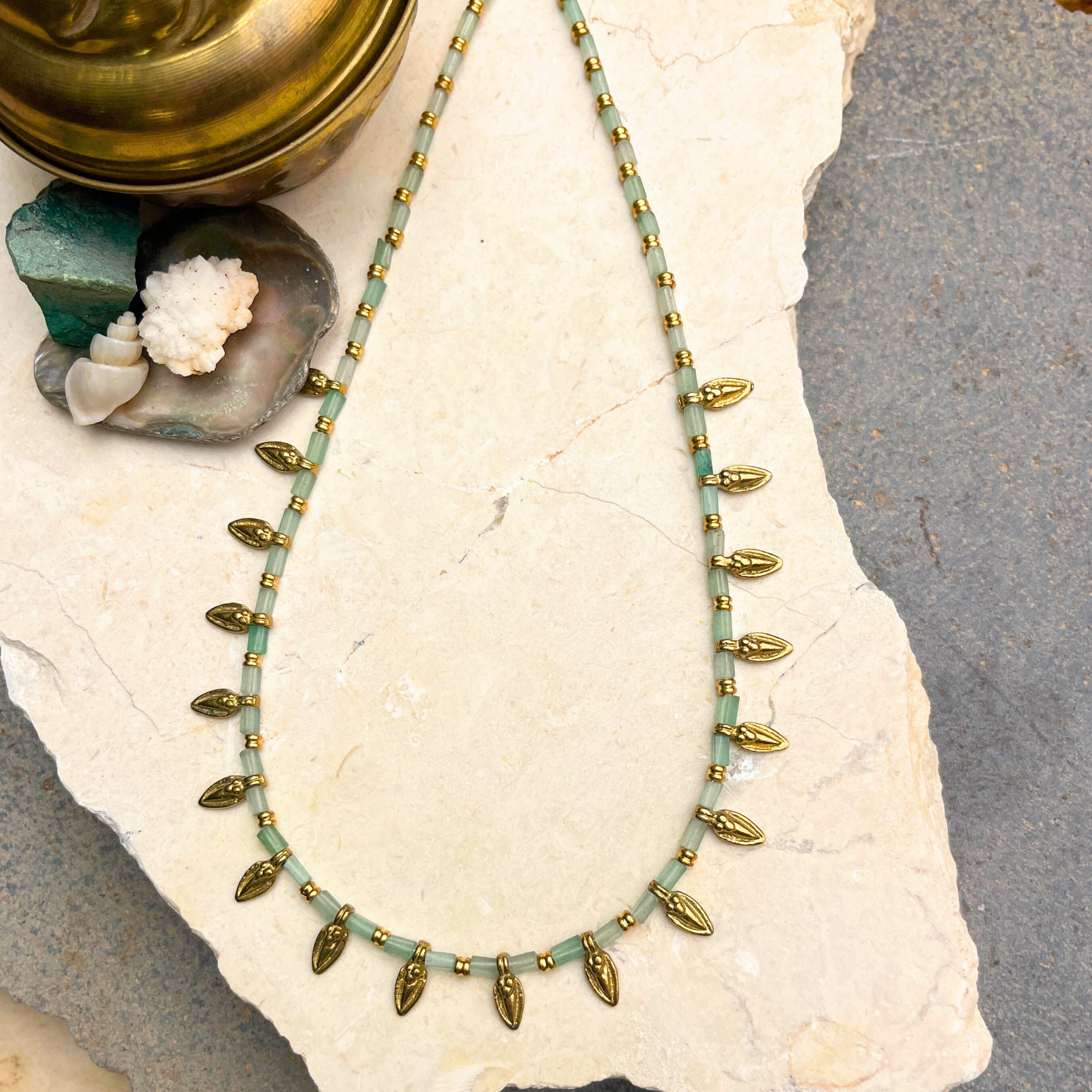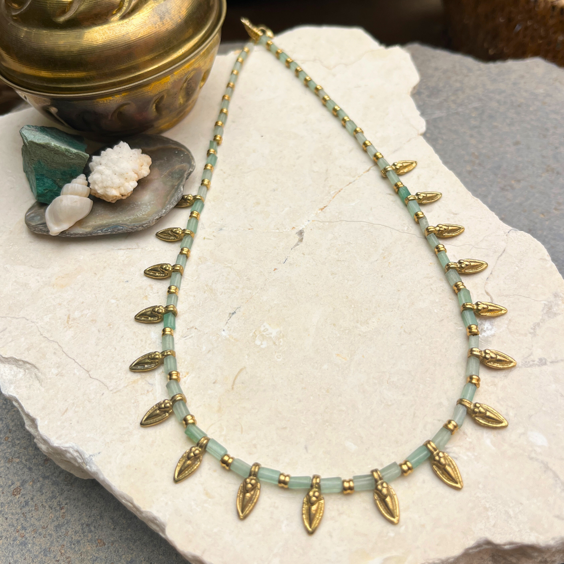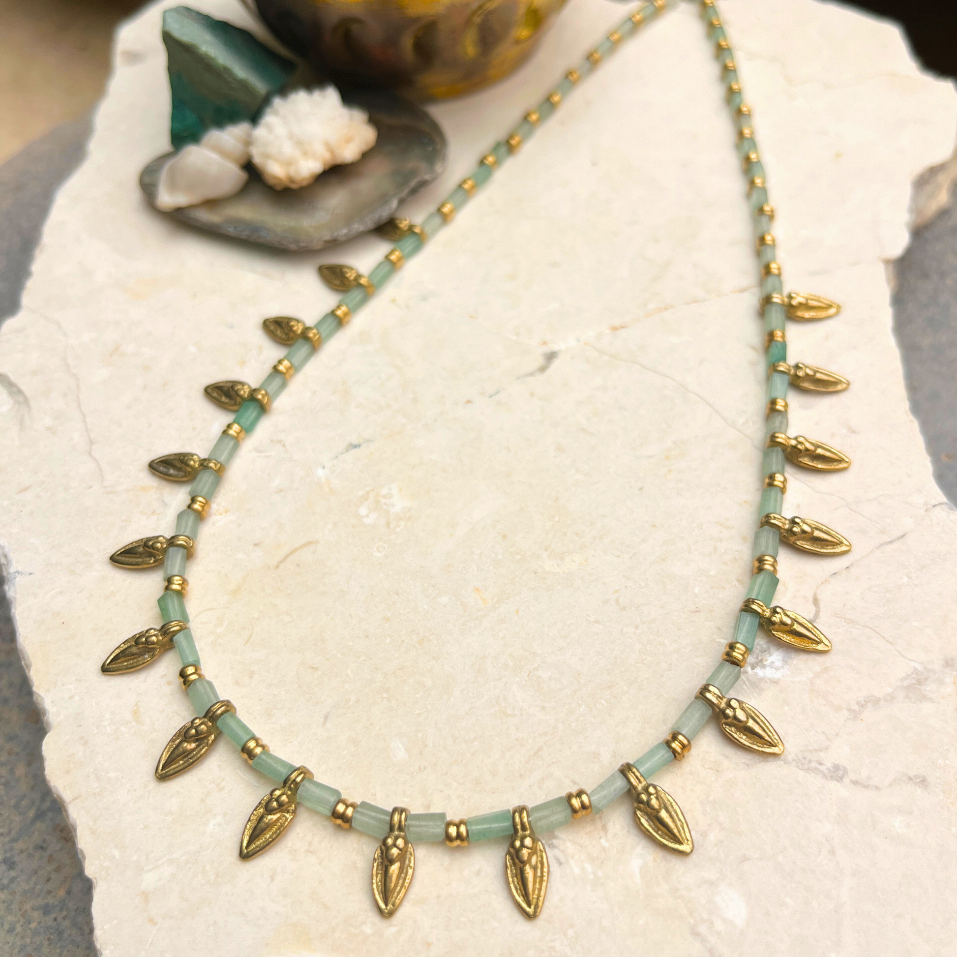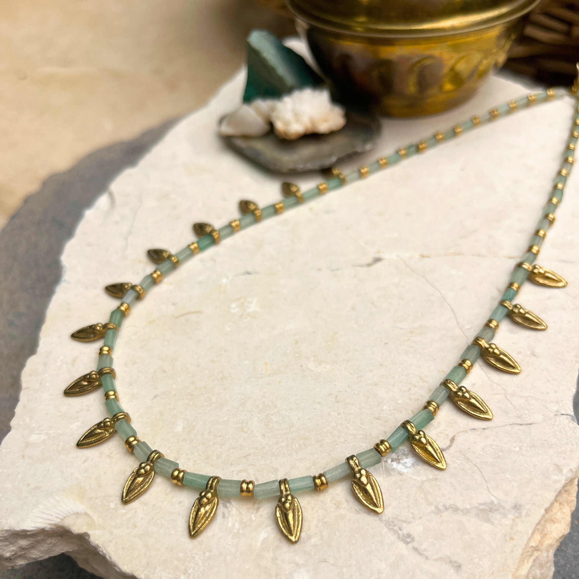 שרשרת שבטית מהממת, עשויה אבני אבנטורין כחולות ותליוני בראס.