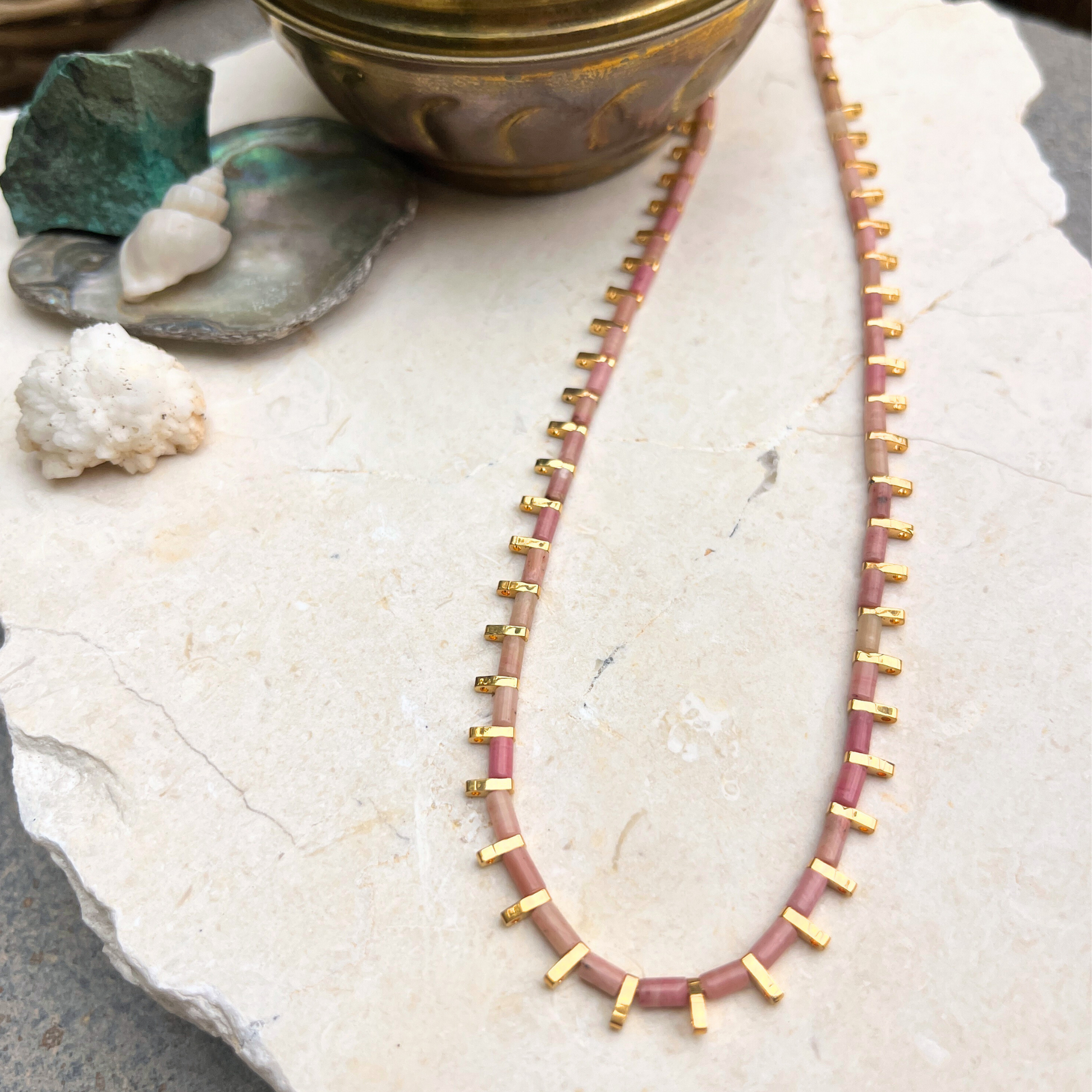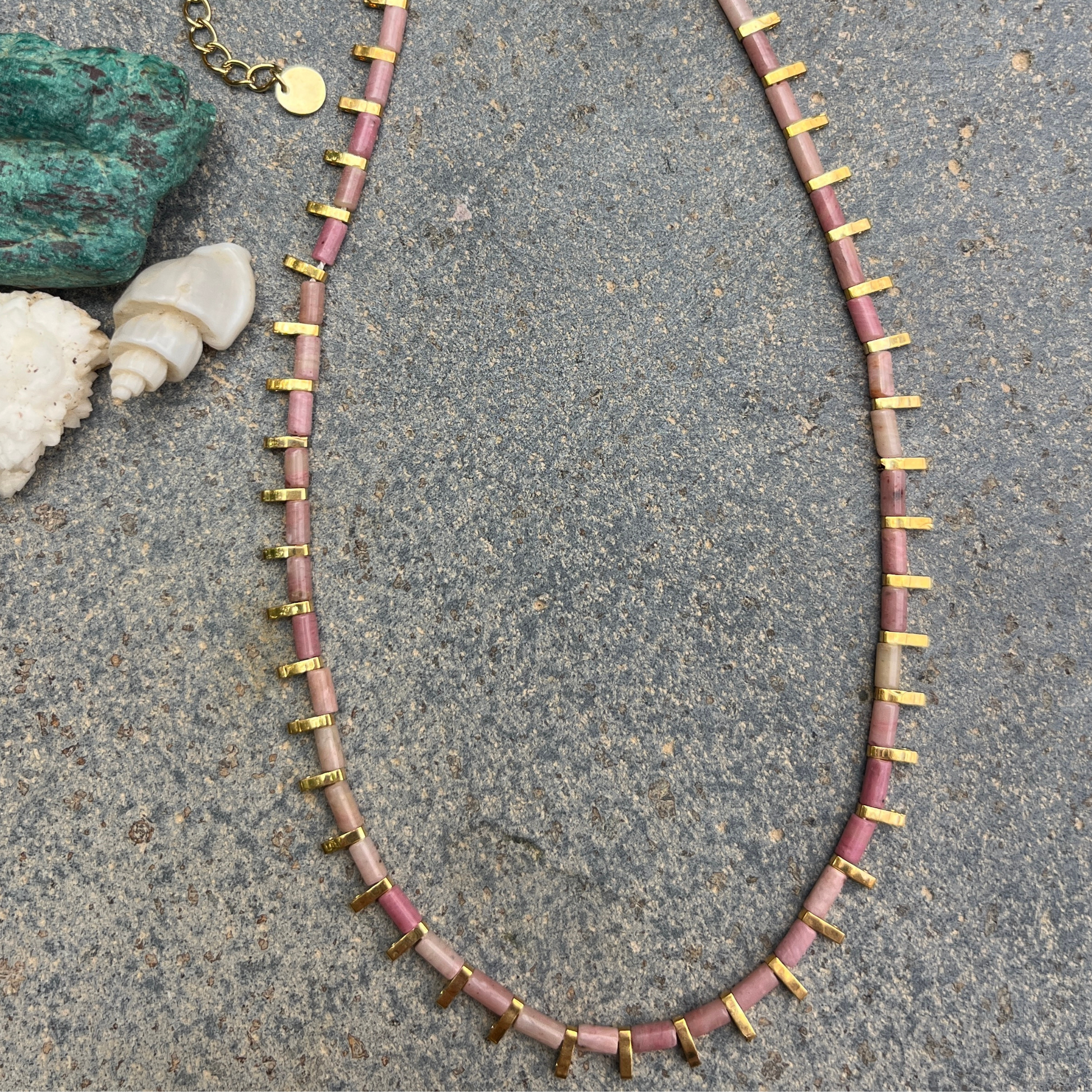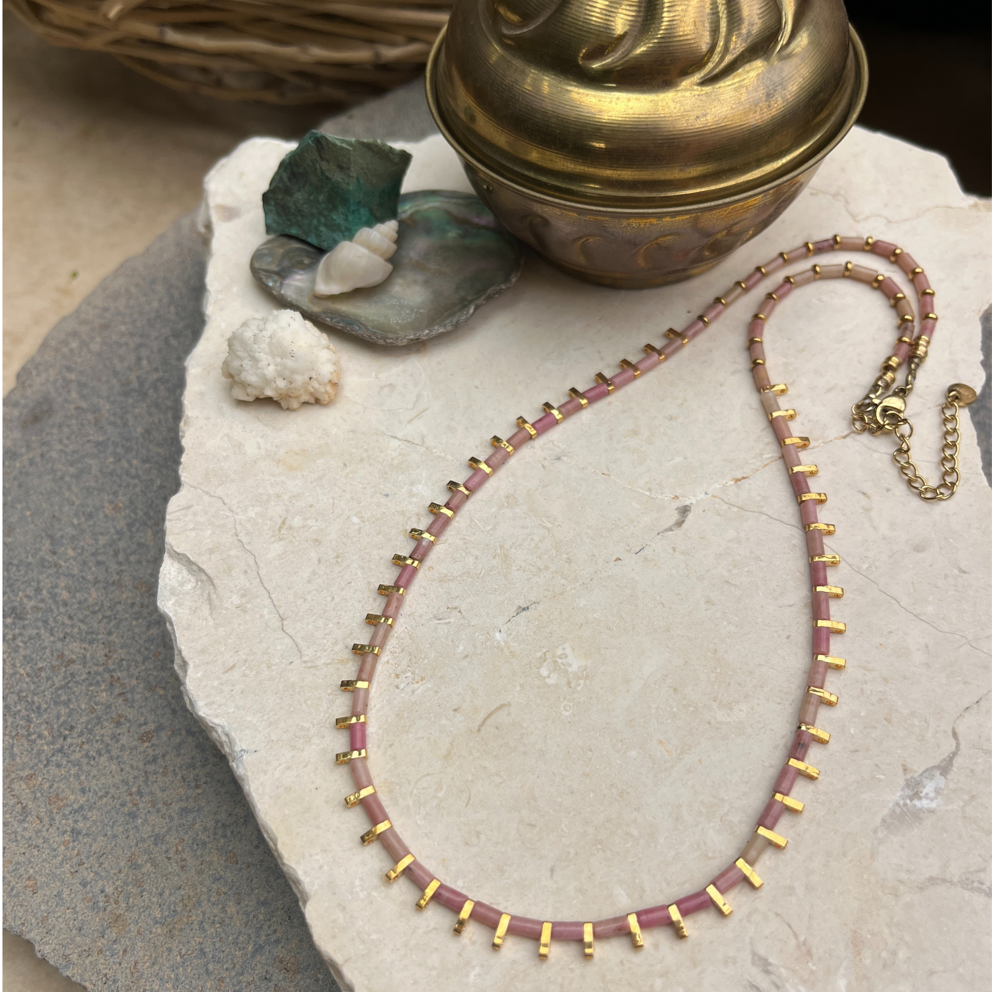 שרשרת שבטית עדינה ומיוחדת בטון רך של ורוד עתיק עם נגיעות של זהב. עשויה חרוזי אבן רודונייט וחרוזי זכוכית יפניים.