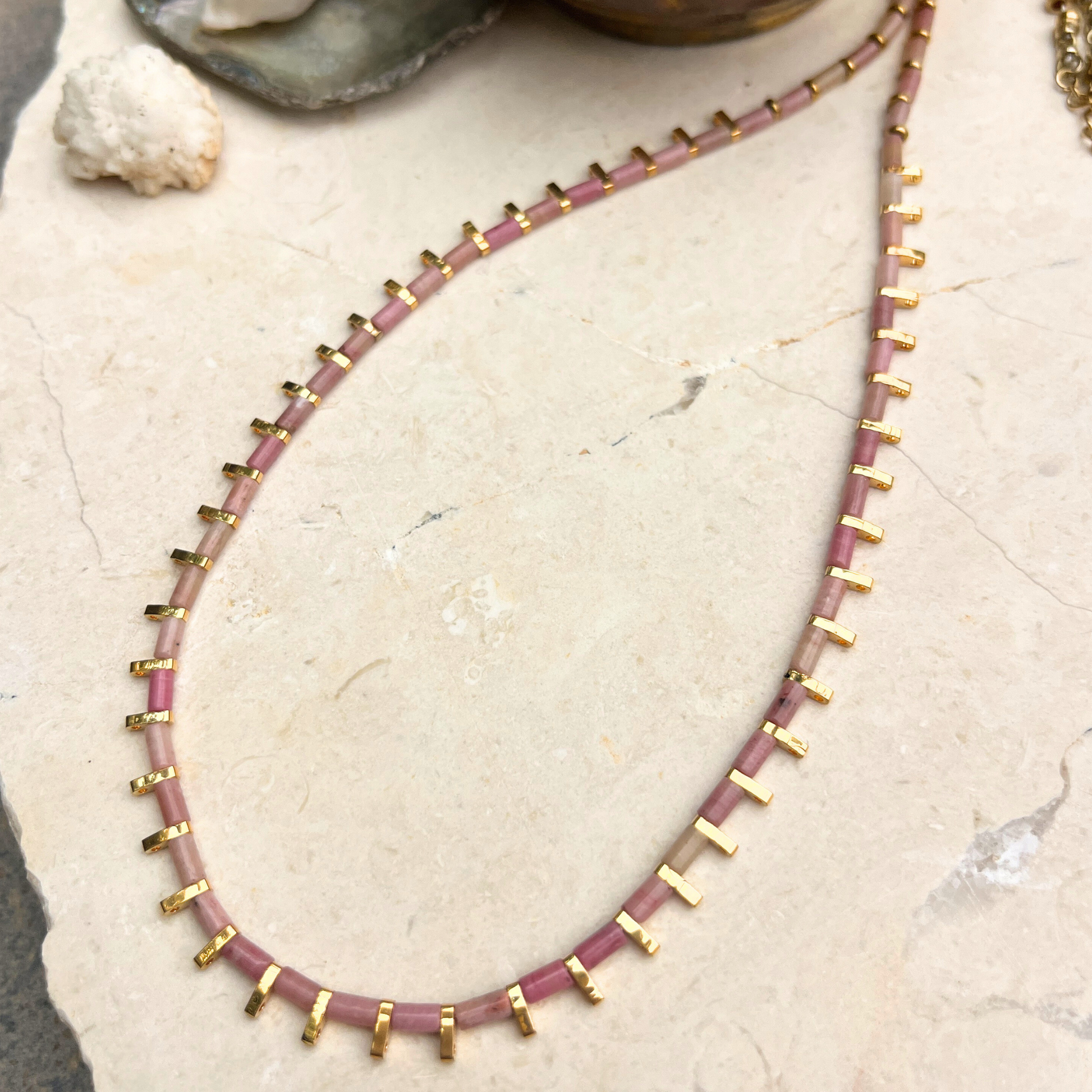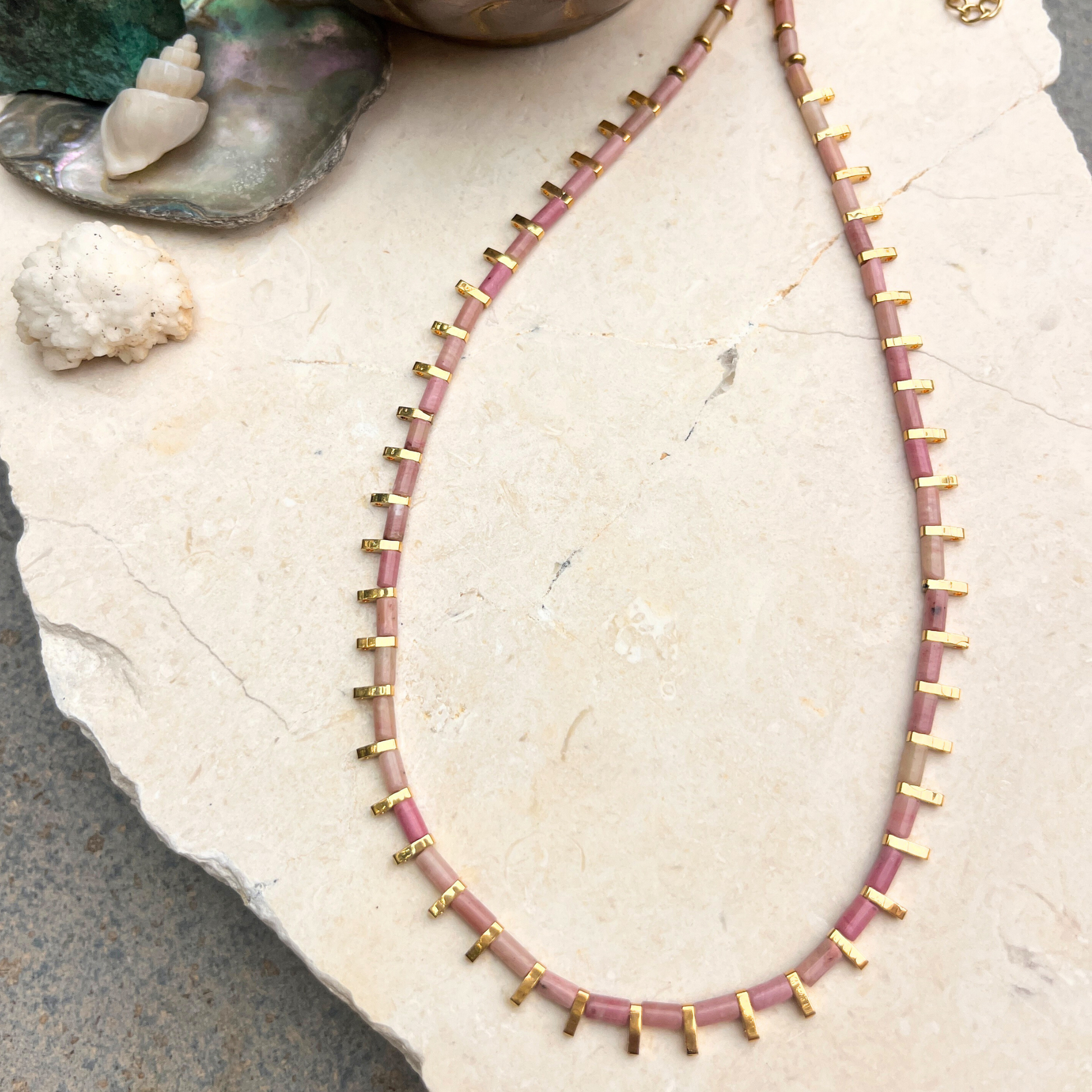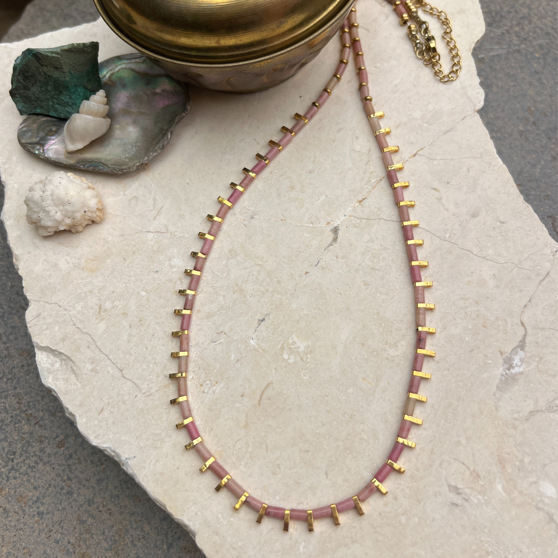 שרשרת שבטית עדינה ומיוחדת בטון רך של ורוד עתיק עם נגיעות של זהב. עשויה חרוזי אבן רודונייט וחרוזי זכוכית יפניים.